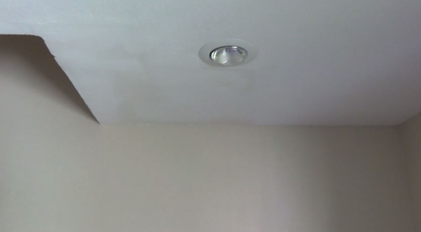 Φανερά σημάδια υγρασίας σε γυψοσανίδα. Ακριβώς από πάνω υπάρχει μπάνιο.